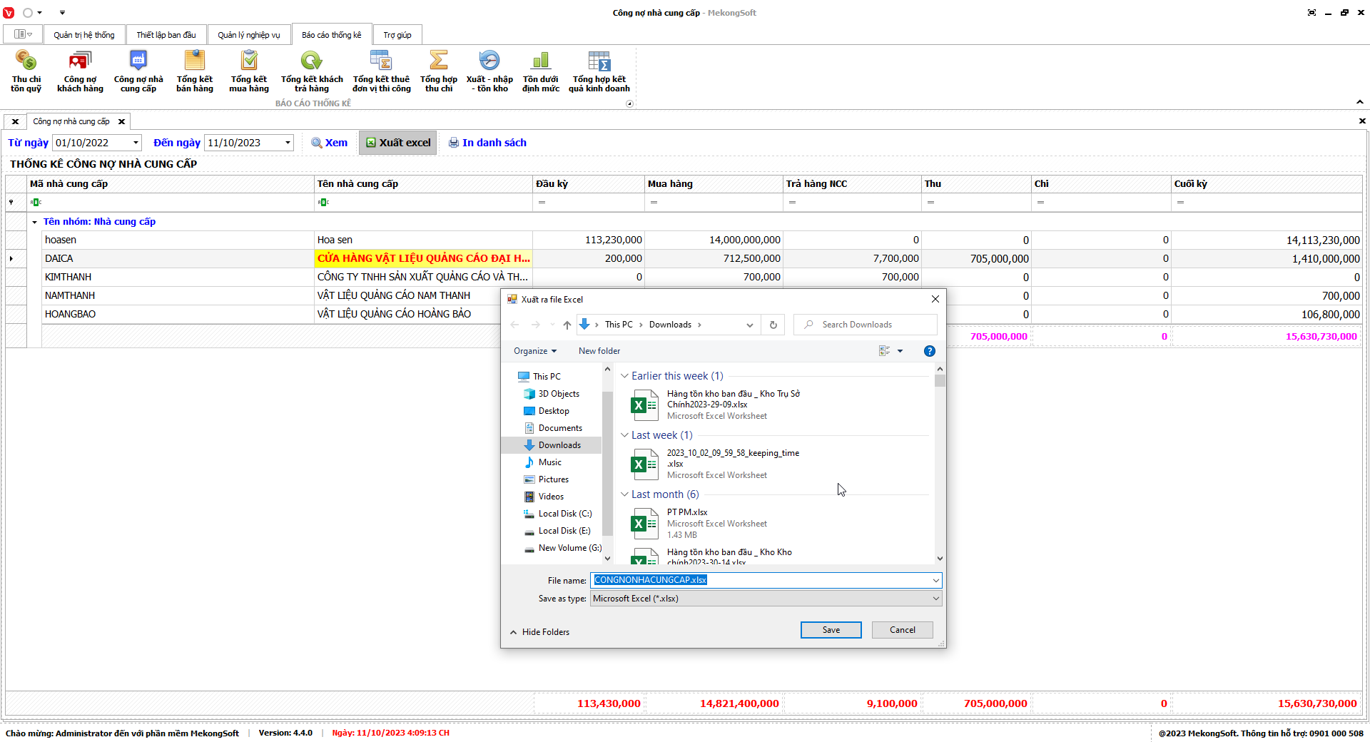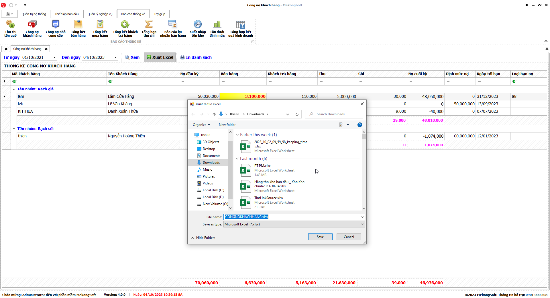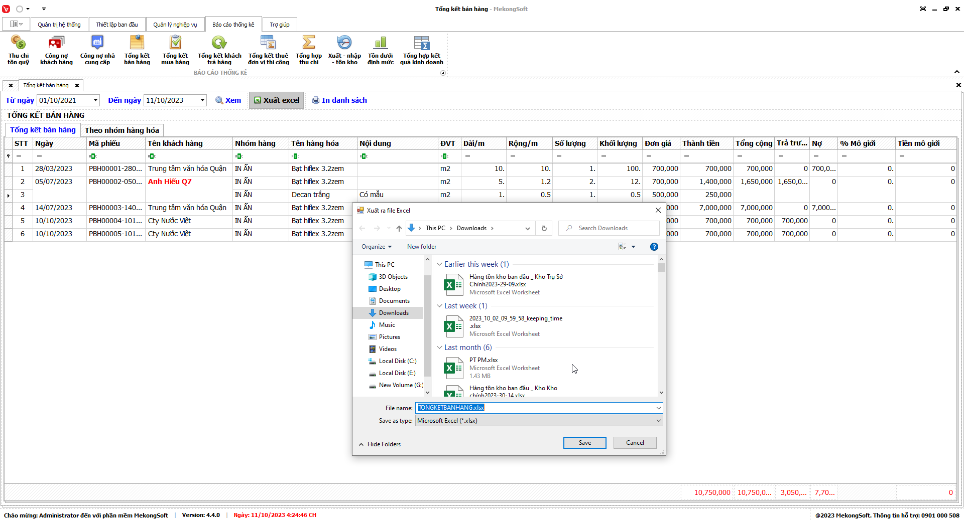 Phần mềm sẽ xuất báo cáo tổng hợp kết quả kinh doanh dưới dạng file excel.