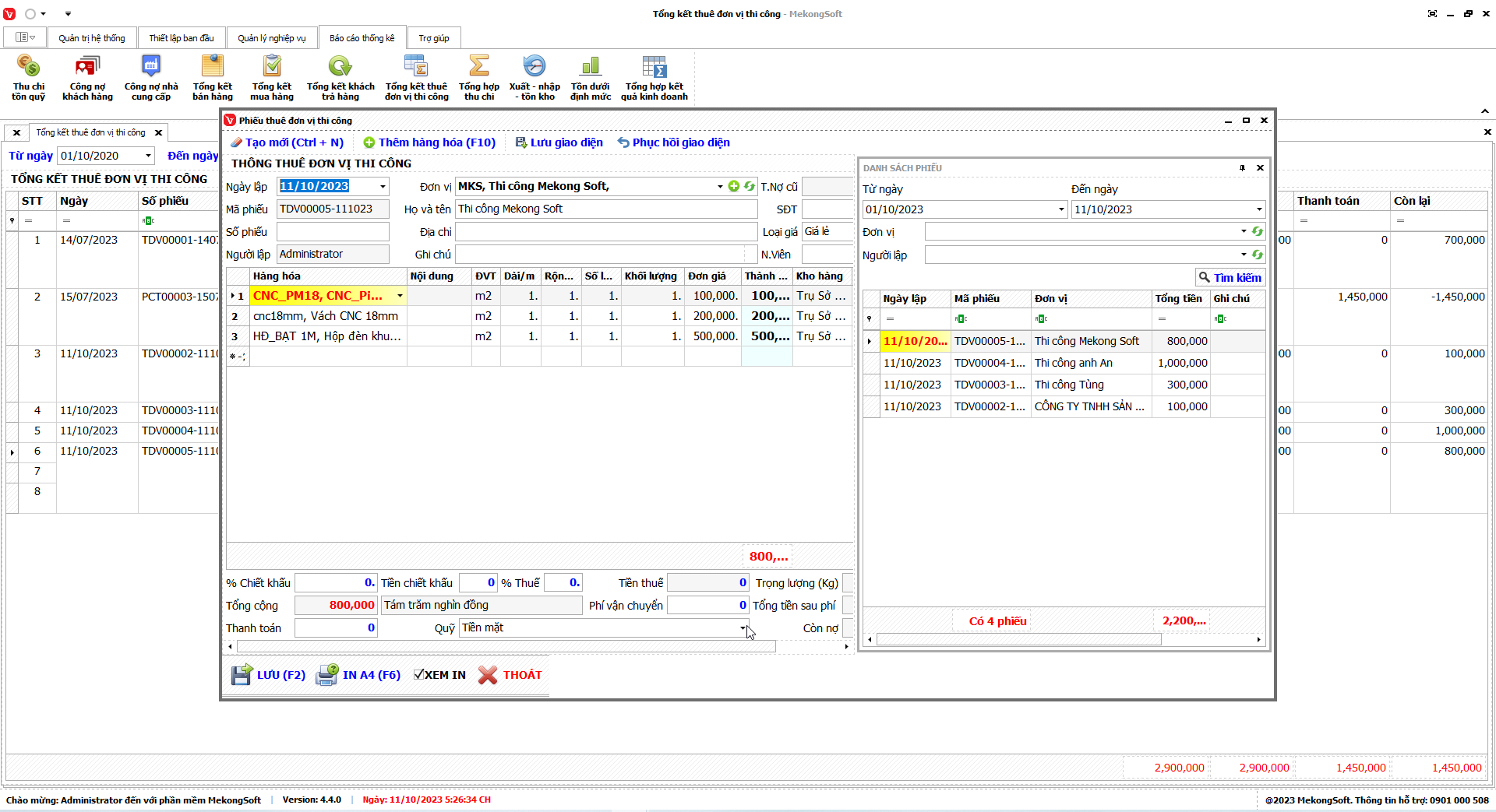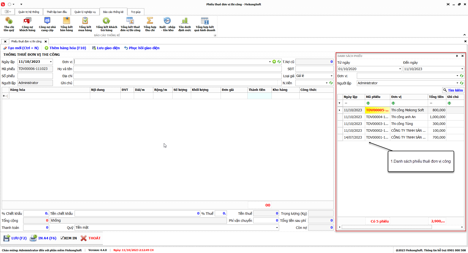 Tại màn hình Báo cáo tổng kết thuê đơn vị thi công