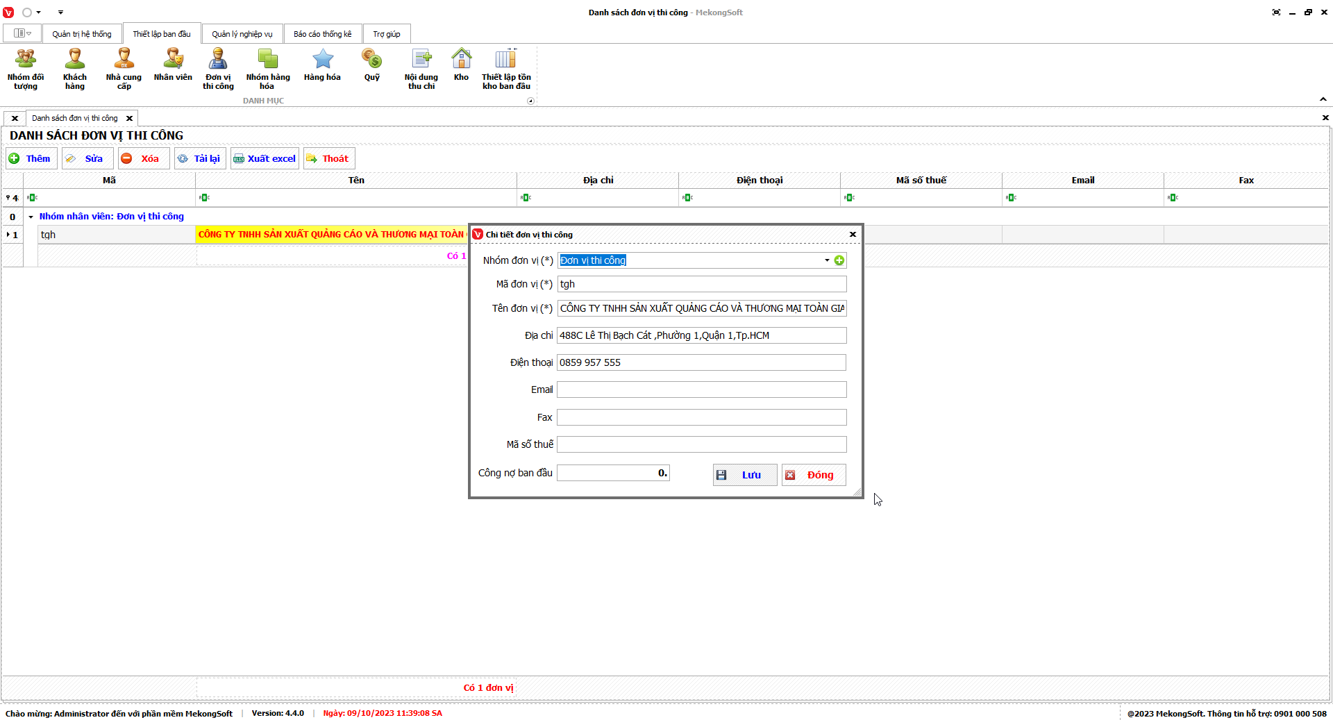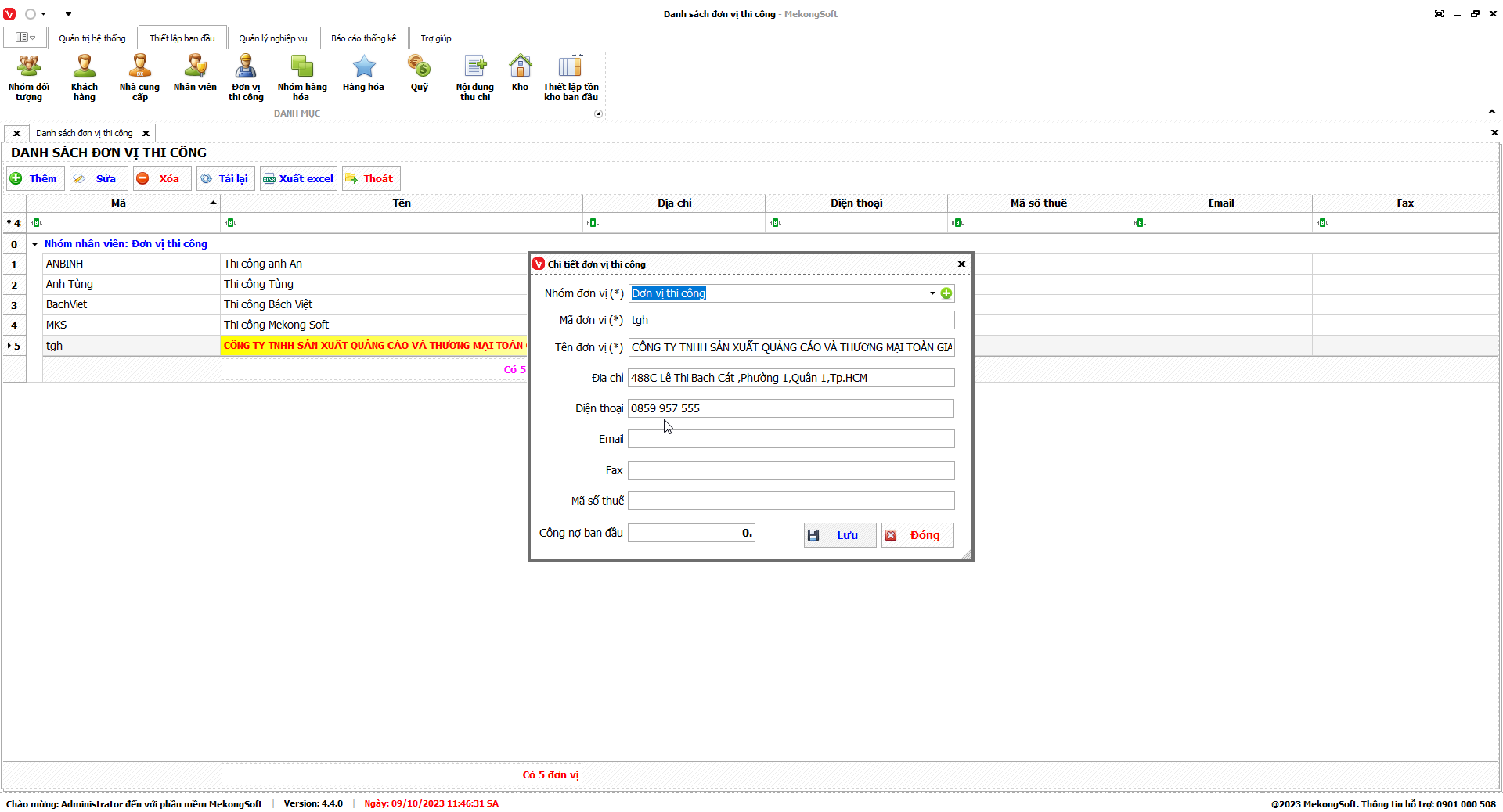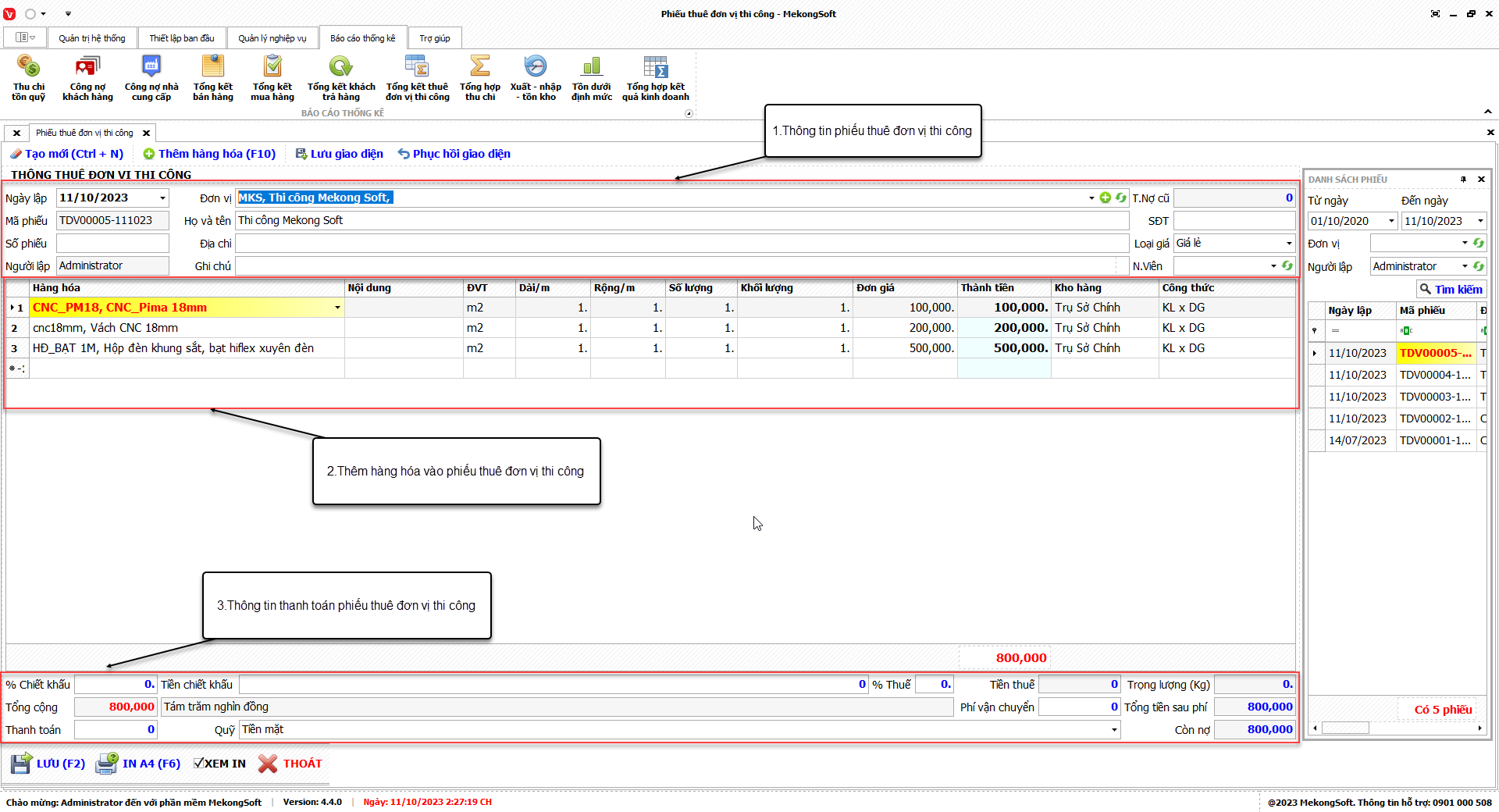 Tại màn hình Tổng kết thuê đơn vị thi công