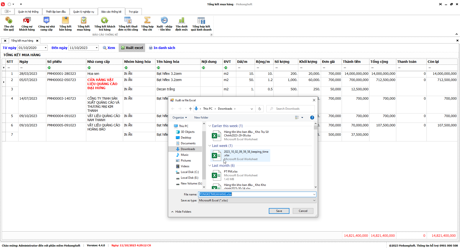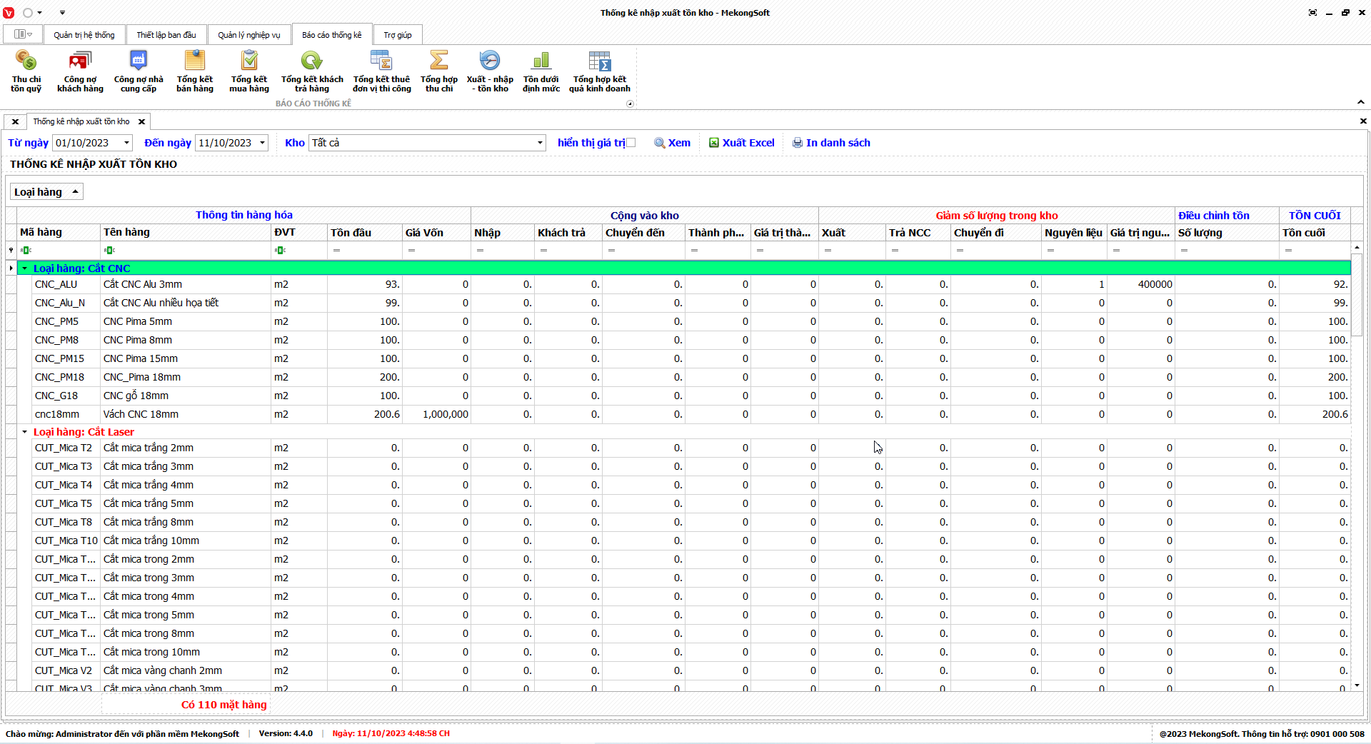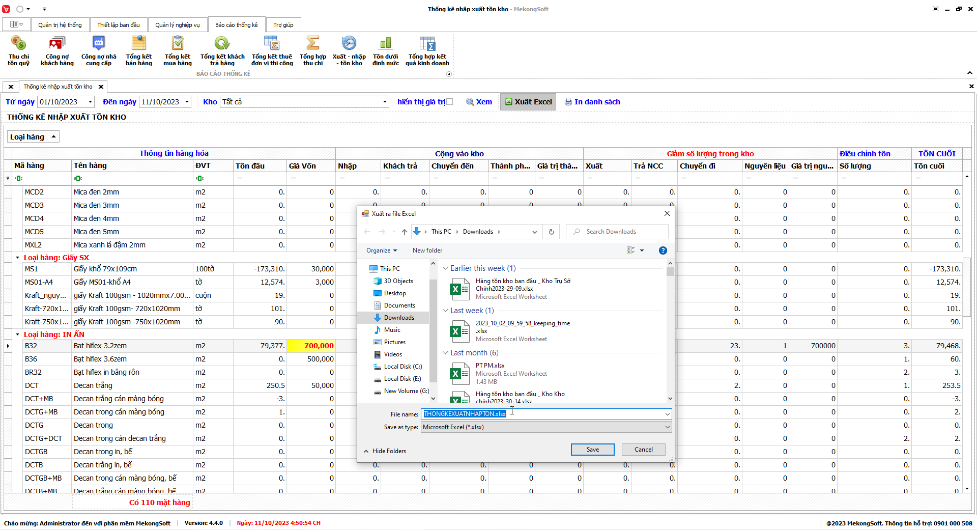 Xuất excel thống kê xuất nhập tồn
