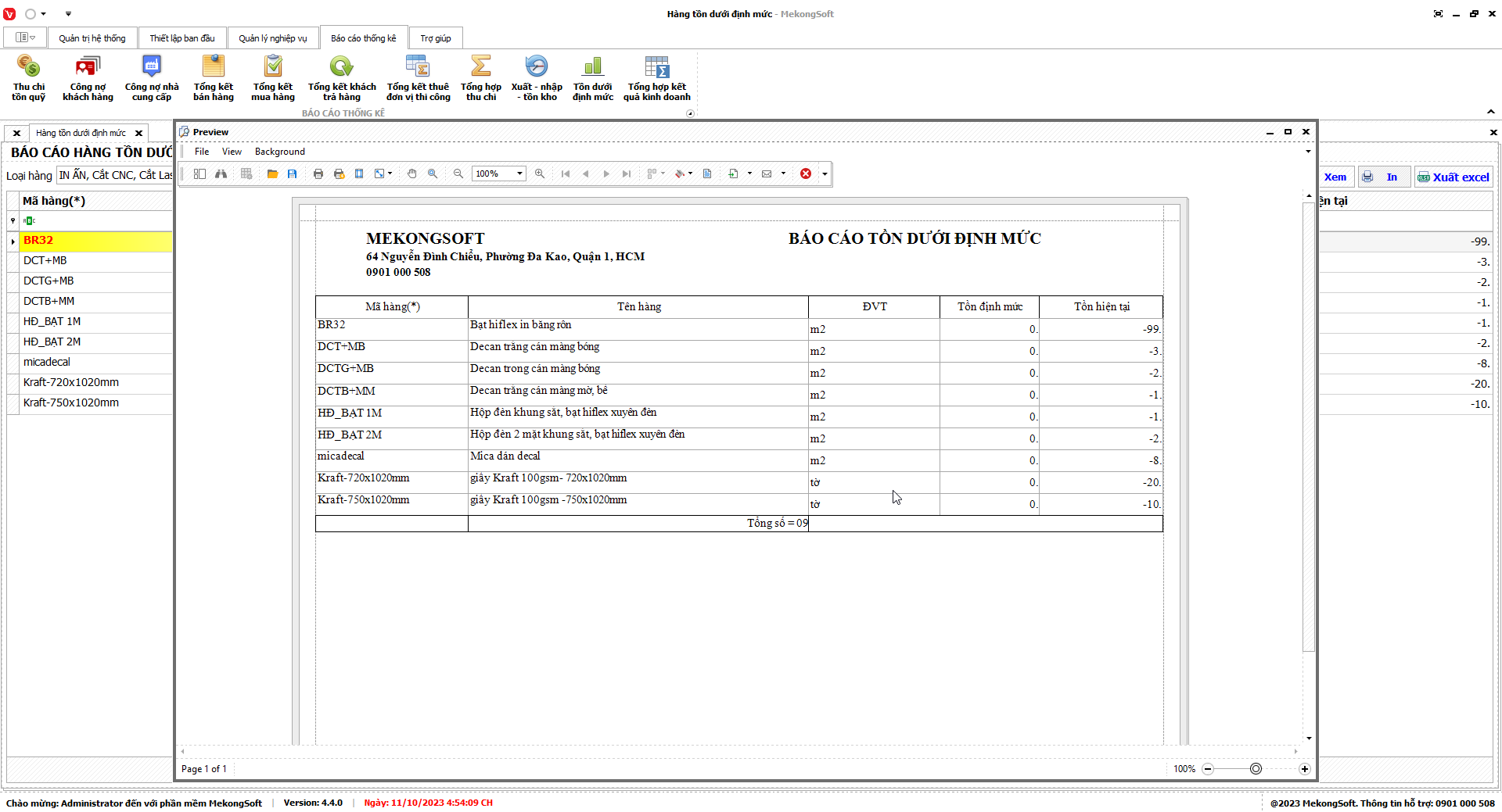 § In thống kê hàng hóa tồn dưới định mức