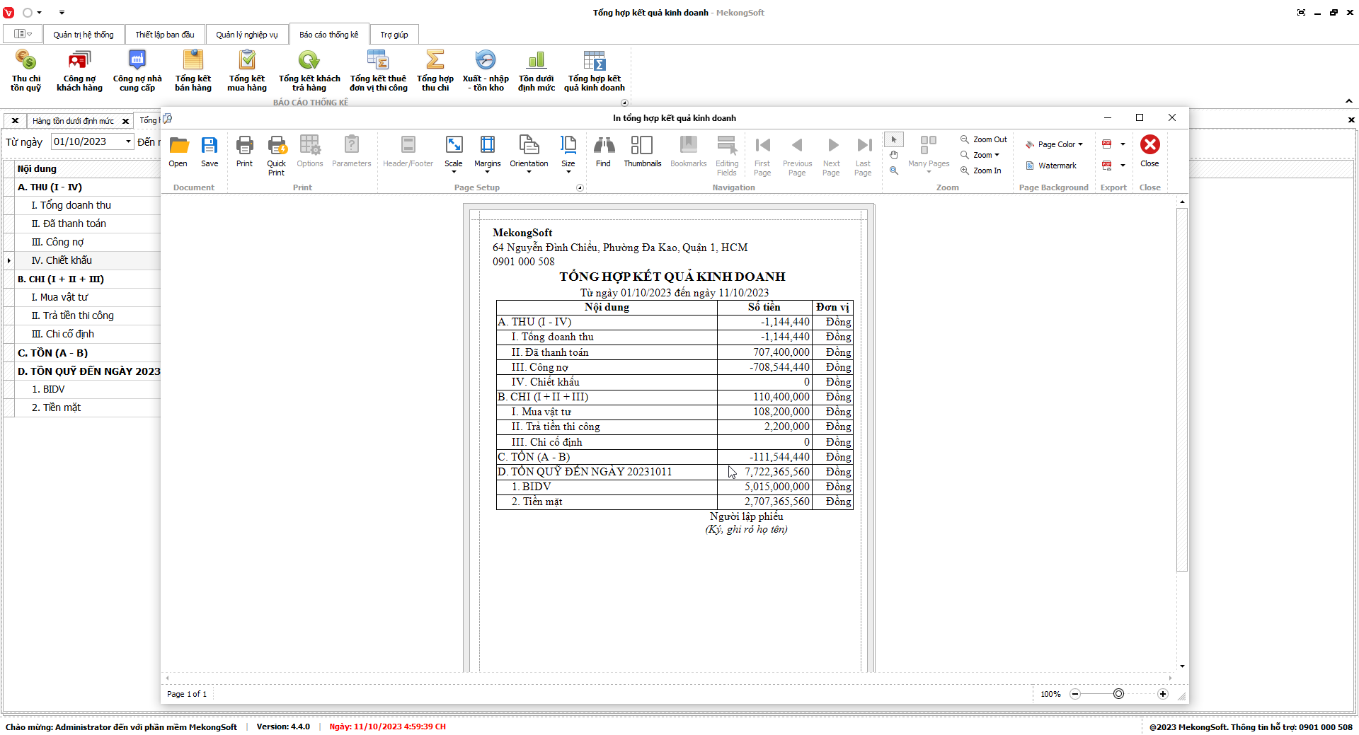 2. Nhấp vào Print để in báo cáo tổng hợp kết quả kinh doanh