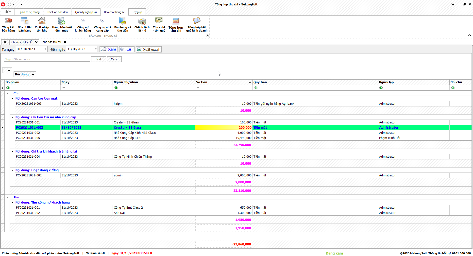 Xuất excel tổng hợp kết quả kinh doanh