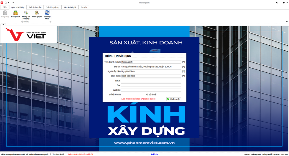 Để thiết lập thông tin sử dụng trên phần mềm quản lý kinh doanh kính xây dựng, bạn có thể thực hiện theo các bước sau: