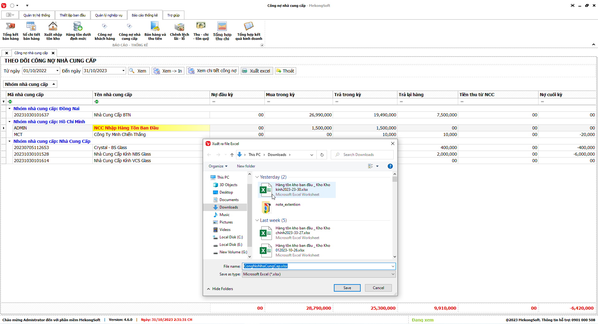 Xuất excel thống kê xuất nhập tồn