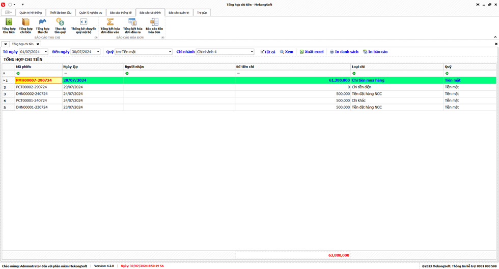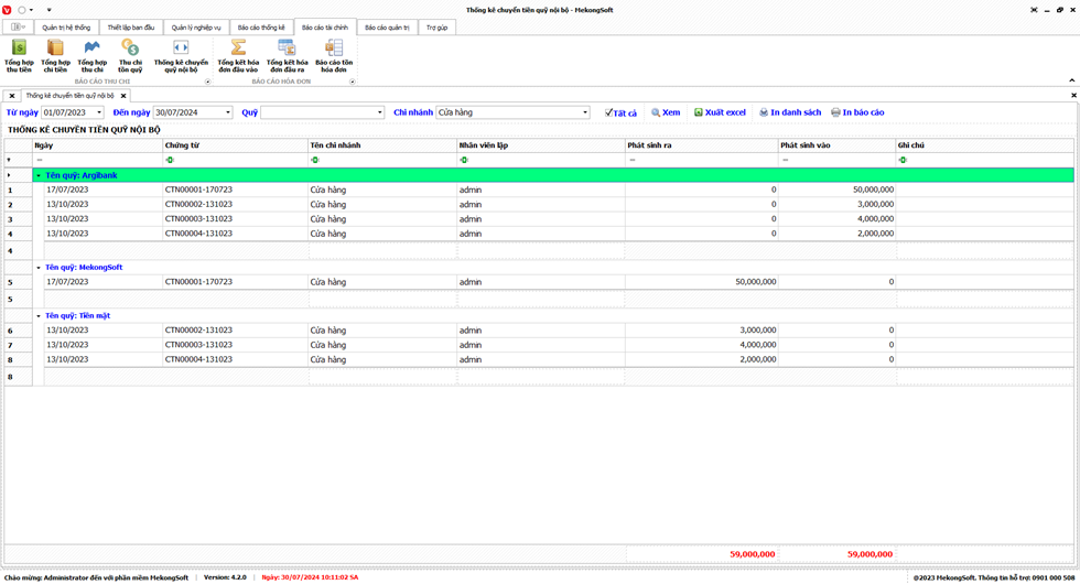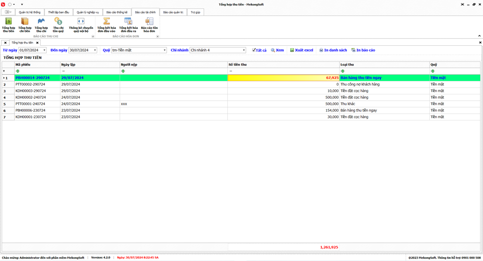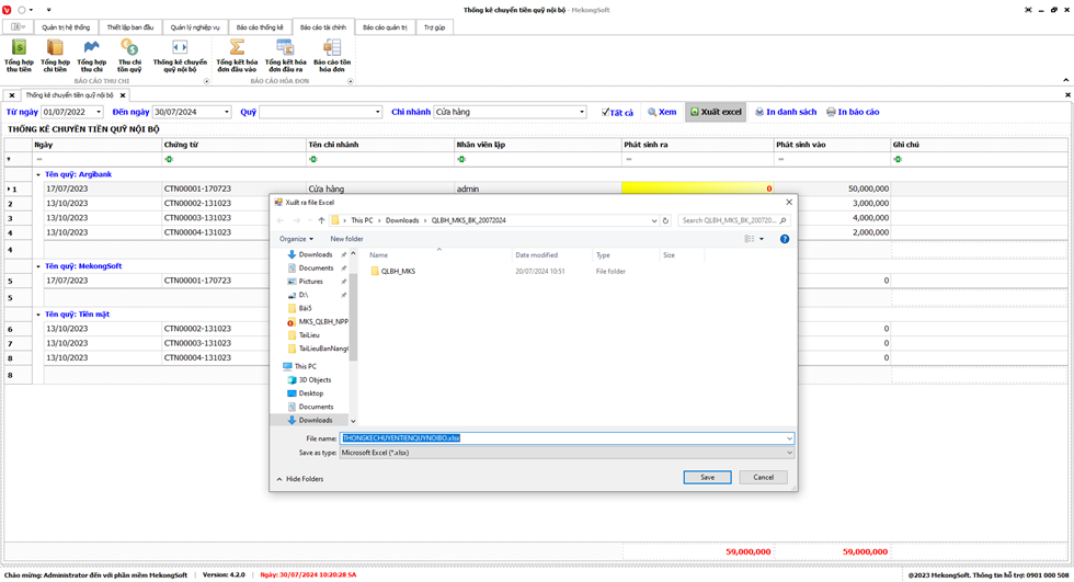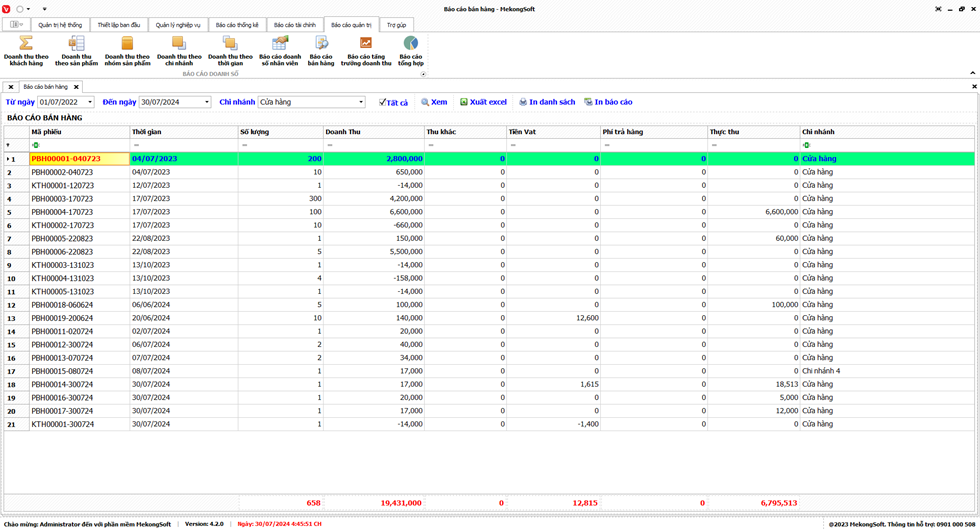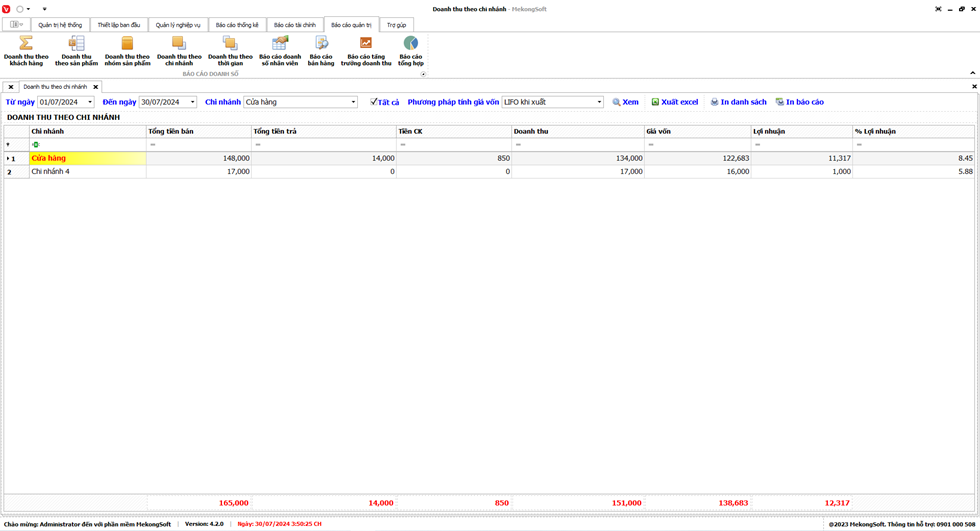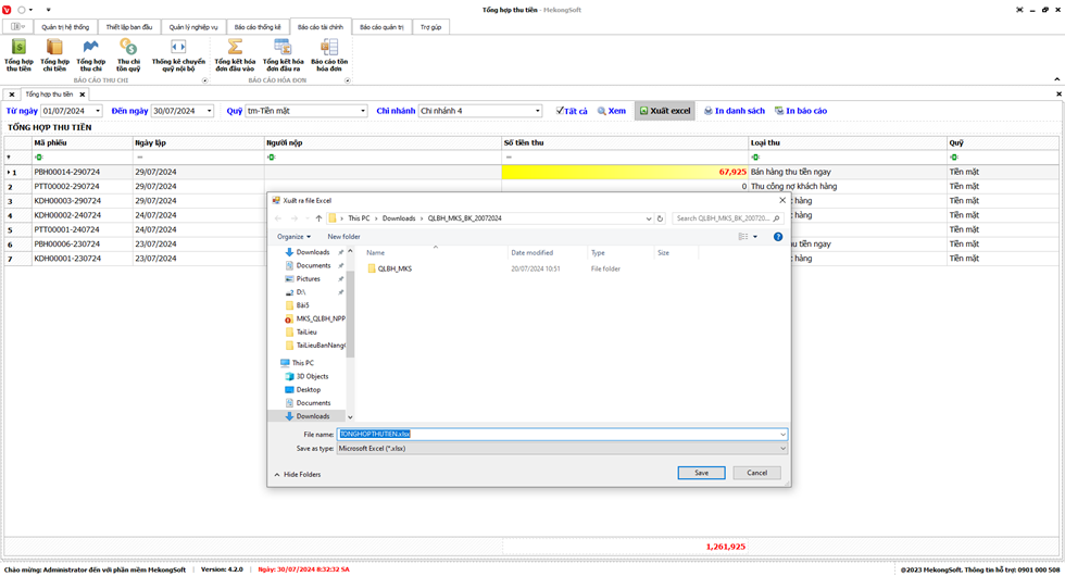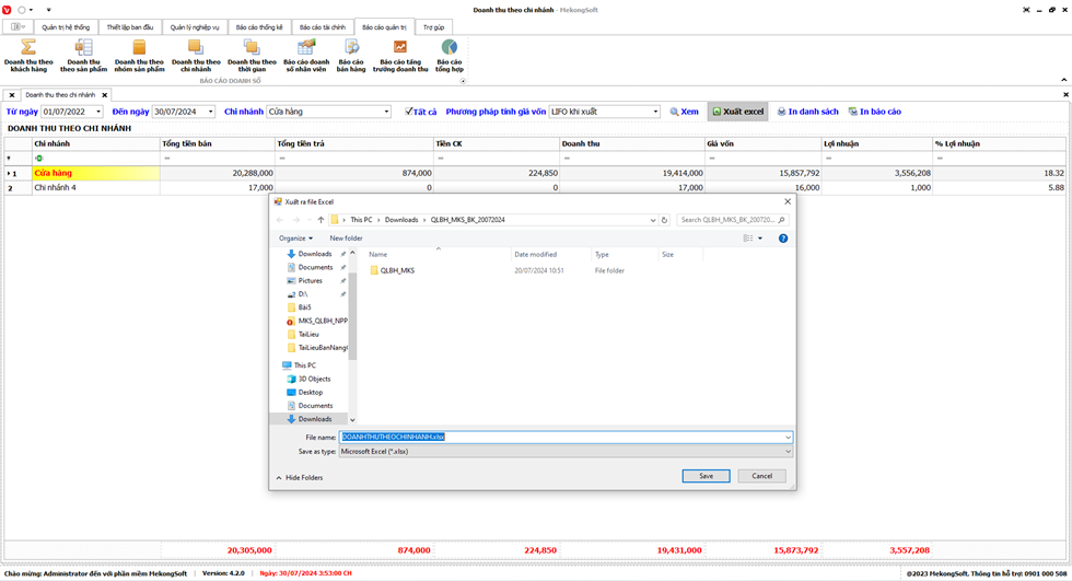 Phần mềm sẽ xuất Doanh thu theo chi nhánh dưới dạng file excel.