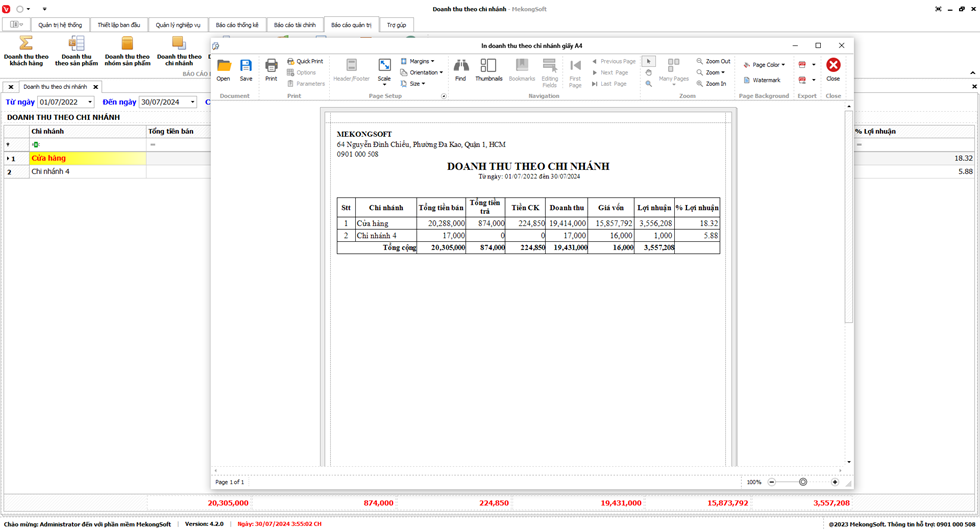 Để in Doanh thu theo chi nhánh trên phần mềm quản lý bán hàng vật liệu xây dựng, bạn có thể thực hiện theo các bước sau: