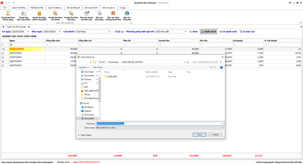 Phần mềm sẽ xuất Doanh thu theo thời gian dưới dạng file excel.
