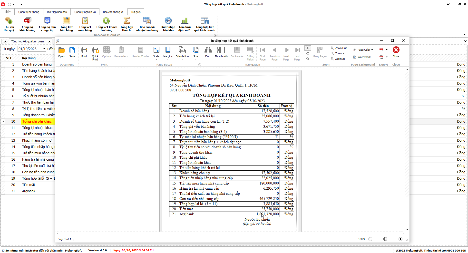 2. Nhấp vào Print để in báo cáo tổng hợp kết quả kinh doanh