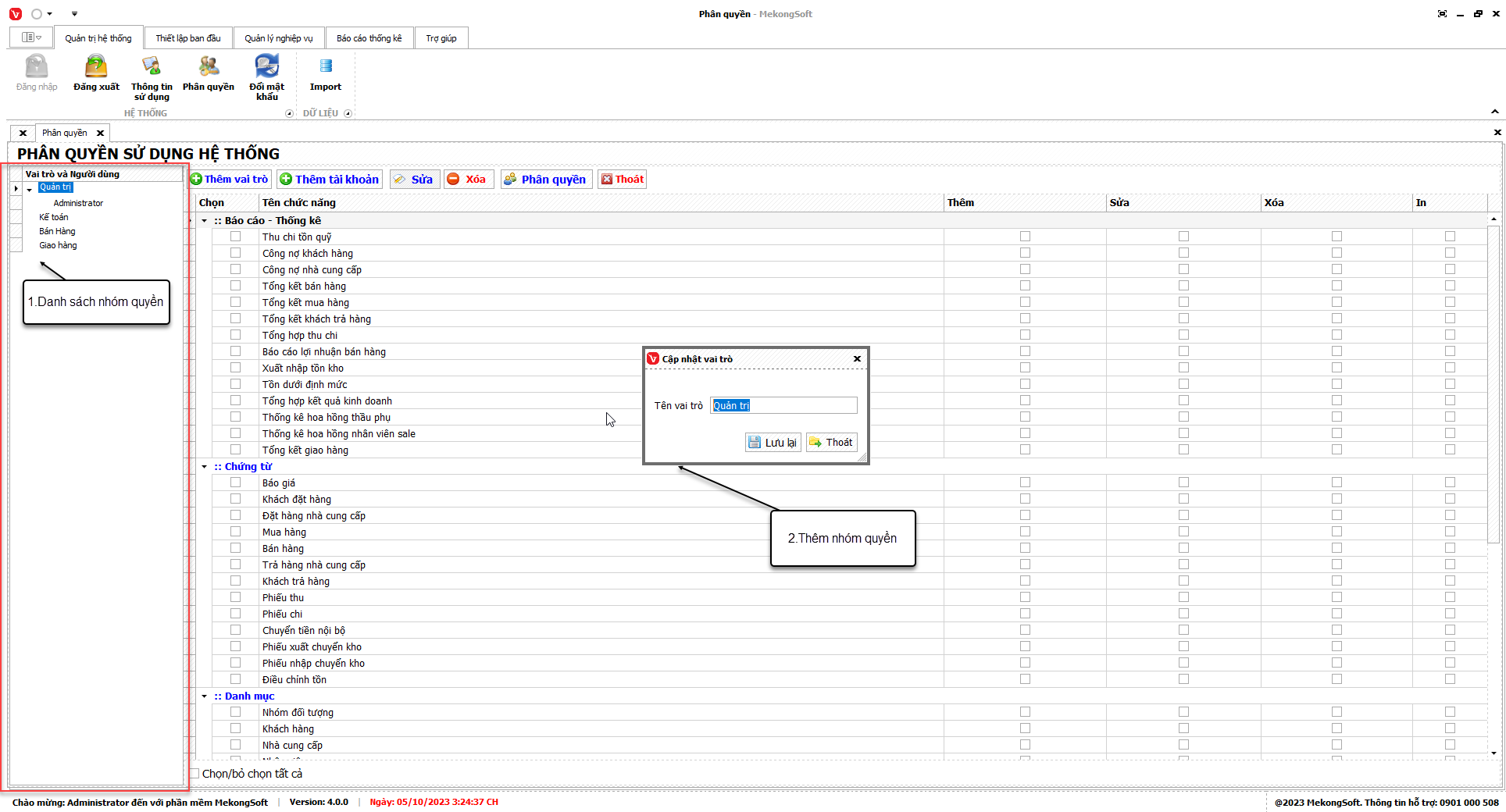 Để tạo nhóm quyền trên phần mềm bán hàng vật liệu xây dựng, bạn có thể thực hiện theo các bước sau: