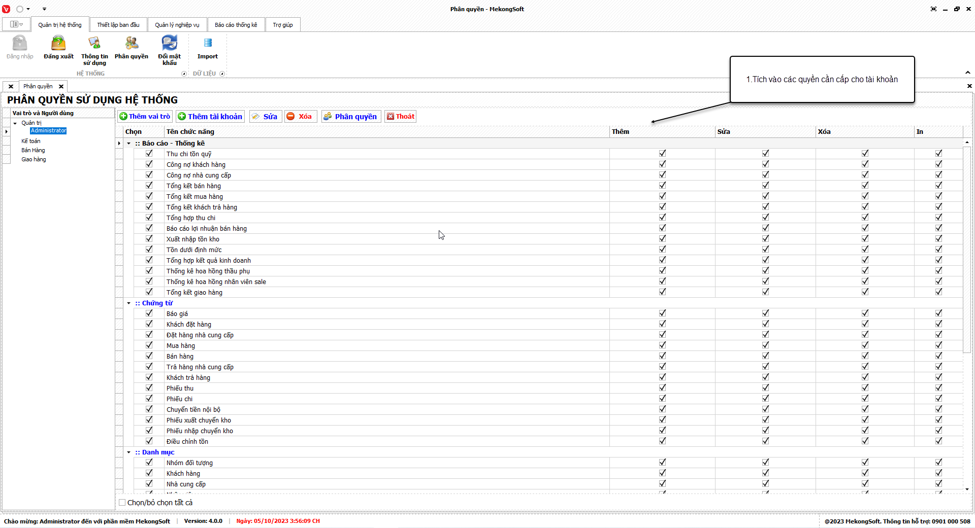Để mở chức năng phần quyền trên phần mềm bán hàng vật liệu xây dựng, bạn có thể thực hiện theo các bước sau:
